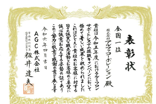 AGC株式会社様主催の「2023年度ルミフロンサポートシステム成績優秀会社表彰式」に招待され、【全国