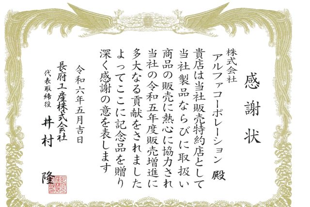 長府工産株式会社様より、令和5年度住宅用太陽光発電・蓄電システムの普及に貢献したことにより、感謝状を