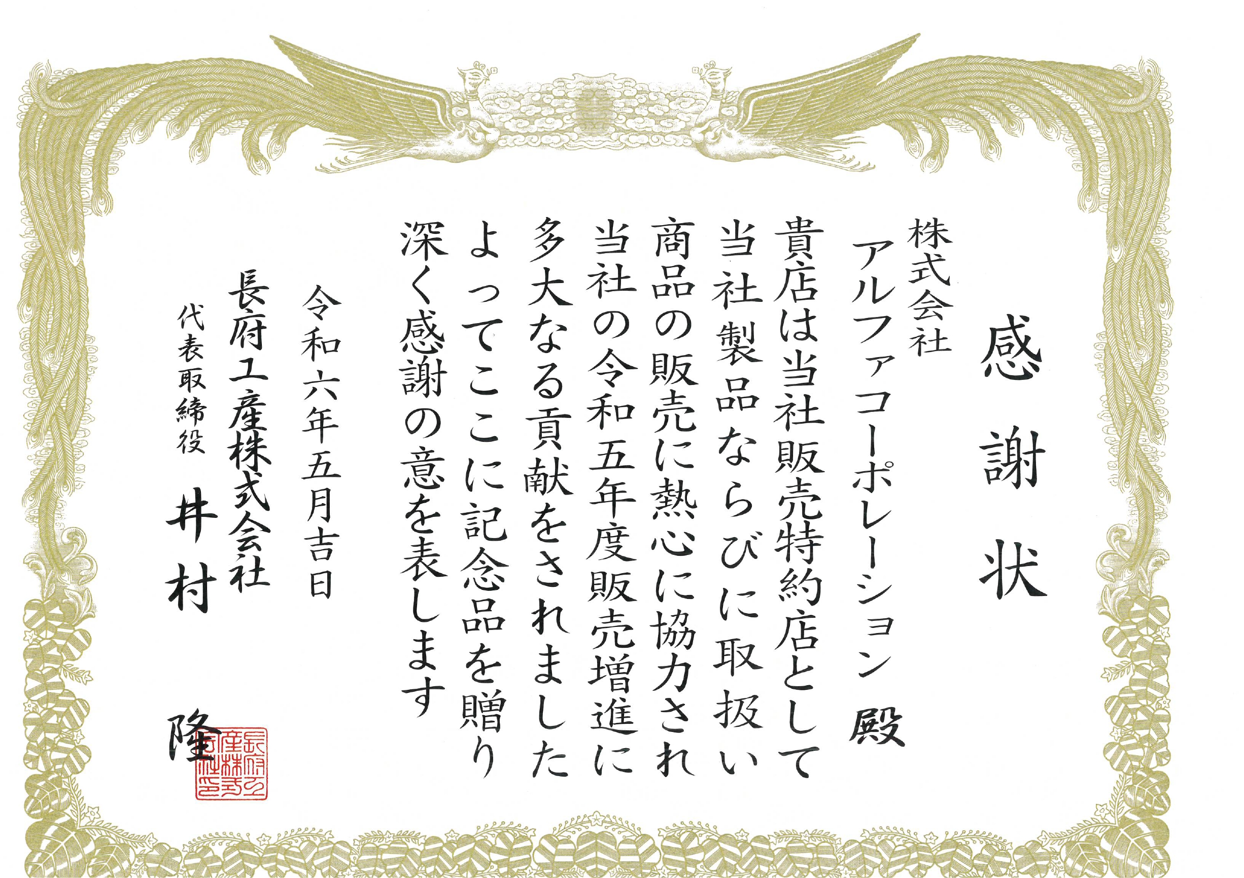 長府工産株式会社様より、令和5年度住宅用太陽光発電・蓄電システムの普及に貢献したことにより、感謝状をいただきました。