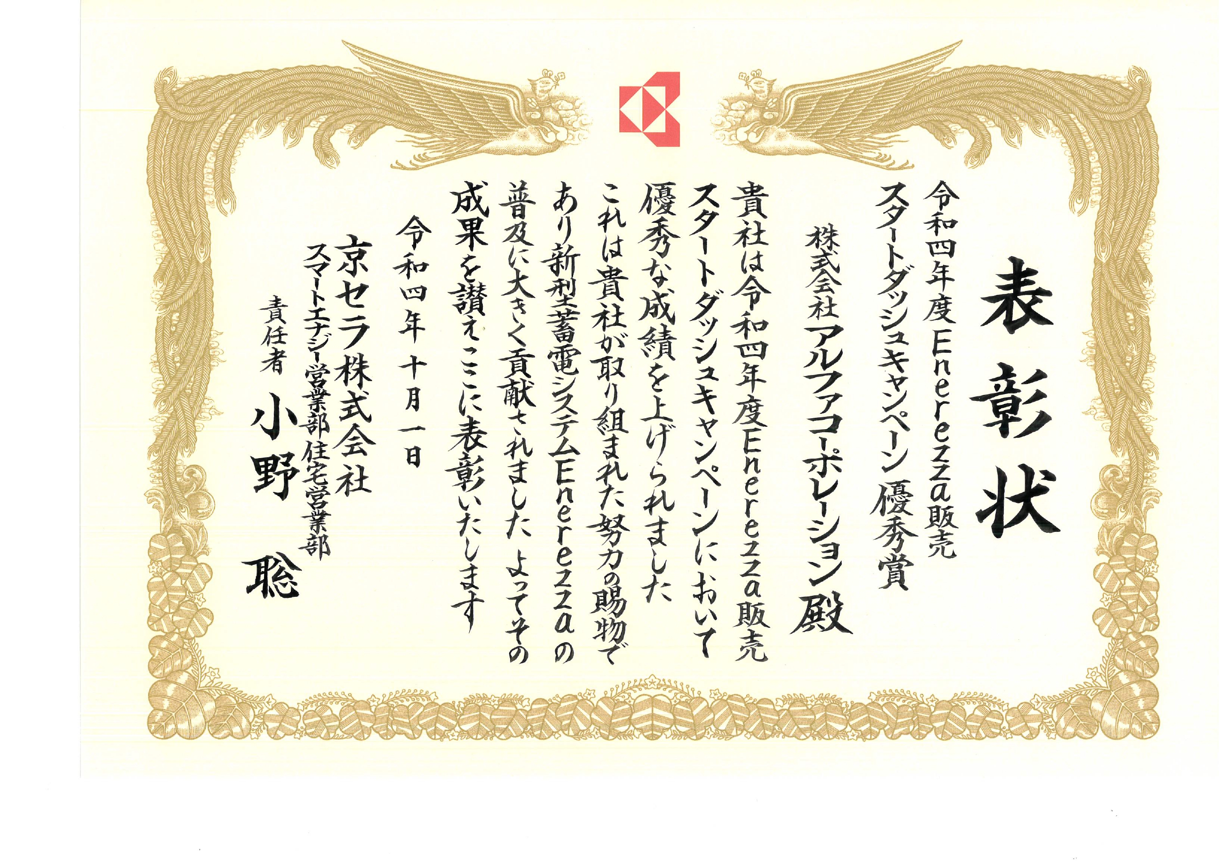 京セラ株式会社様より、新型住宅用蓄電システムの普及に貢献したことにより、表彰状をいただきました。